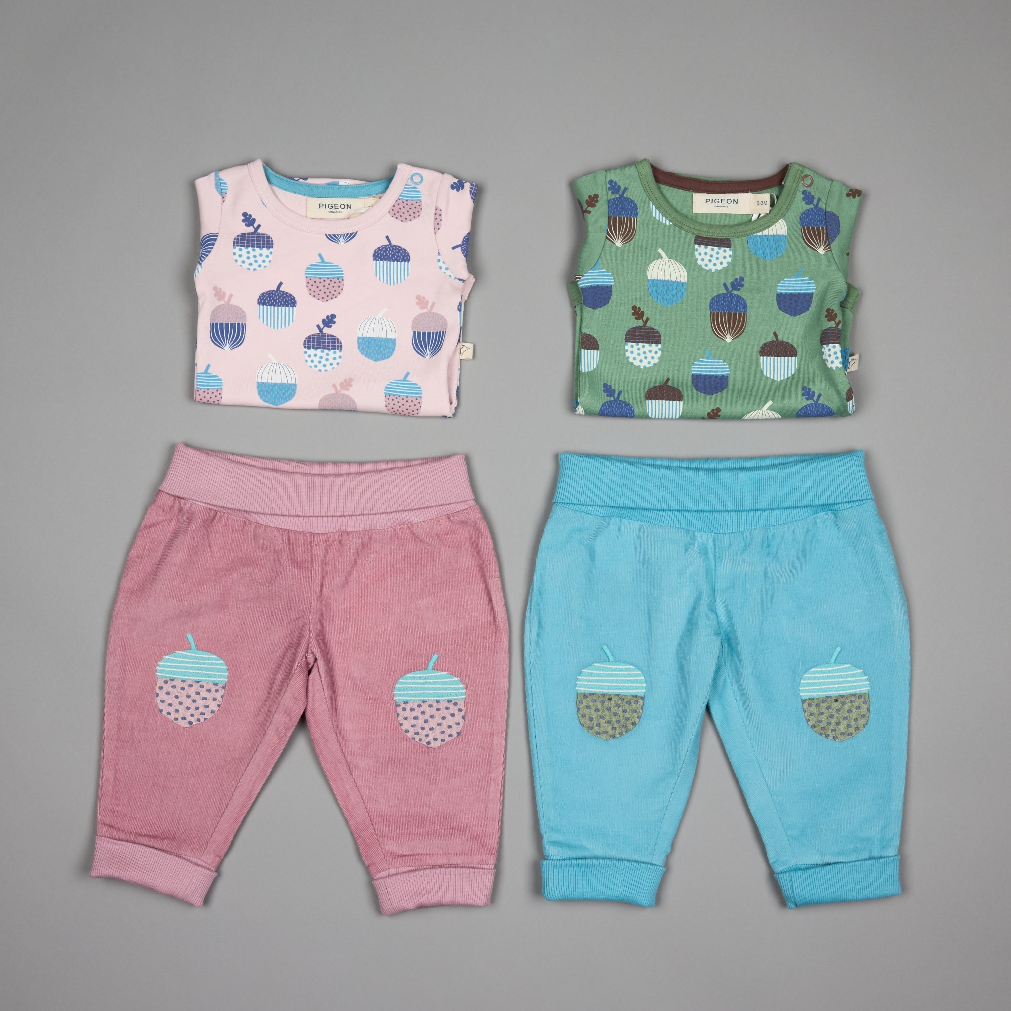 Comfy chunky cord trousers with soft rib at waistband and at ankles to keep the draft out. Acorn embroidery on knees. (Please note: image shows needlecord, but product will be chunky cord.)