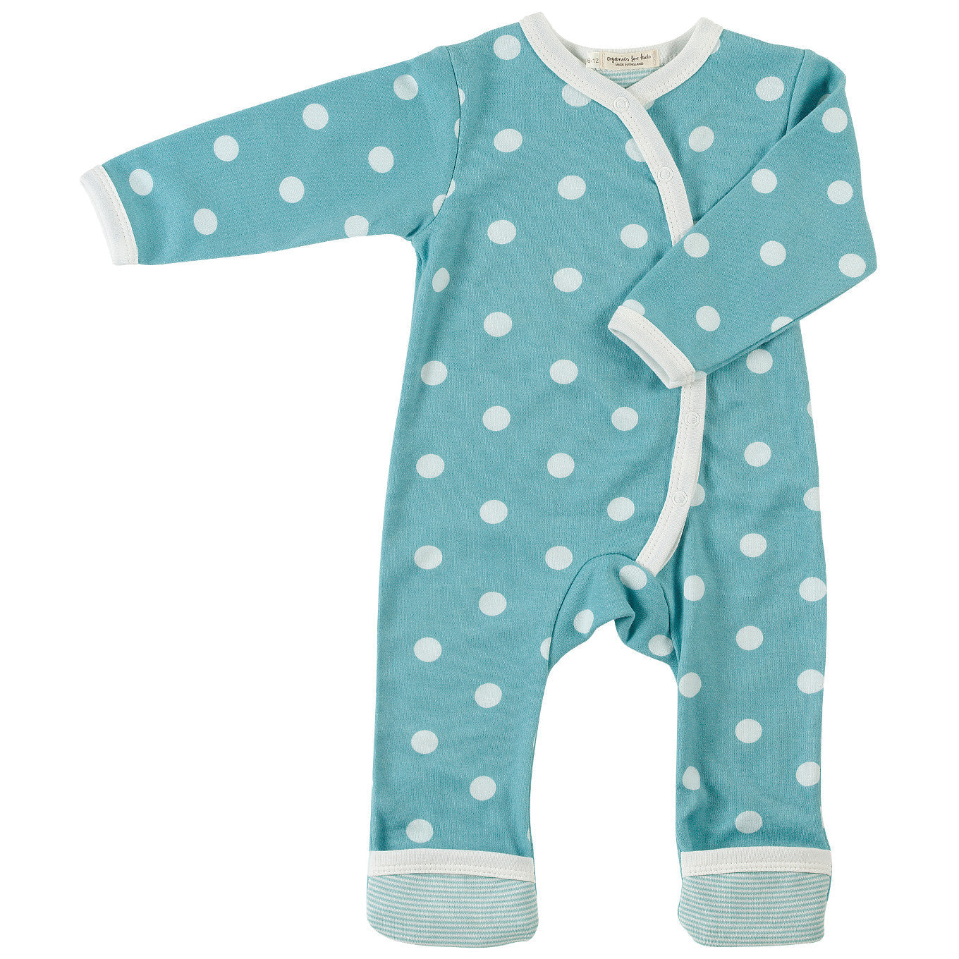 Playful spotty romper with side fastening and contrasting striped cuffs at feet, to keep closed when babies are small, and unfold as they grow. Ivory binding and striped neck buggy detail.